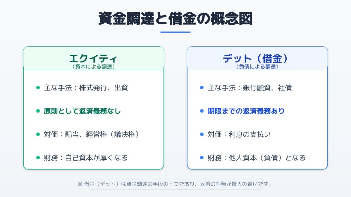 起業や新規事業を始める際によく混同される「資金調達」と「借金」の違いについて解説します。出資(エクイティ)と融資(デット)の本来の意味を正しく理解し、自社の成長フェーズに合った適切な財務戦略を立てるための基礎知識を提供します。