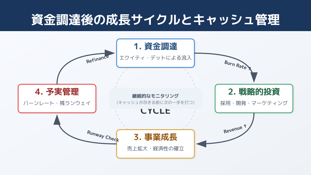 資金調達の完了はゴールではなく、事業成長のスタートに過ぎません。調達した資金をどのようにプロダクト開発やマーケティングへ投資し、売上として回収するかというサイクルを描くことが、財務の基本です。