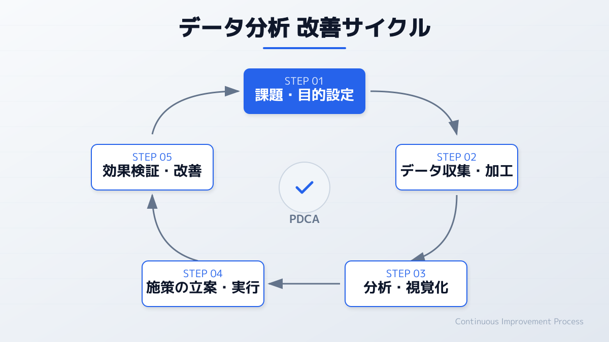 グロースハックを成功に導くための2つ目のステップは、データに基づいた意思決定を徹底することです。直感や過去の経験則に頼るのではなく、ユーザーの行動データを定量的に分析し、改善すべきボトルネックを正確に特定することが企業の成長を加速させます。