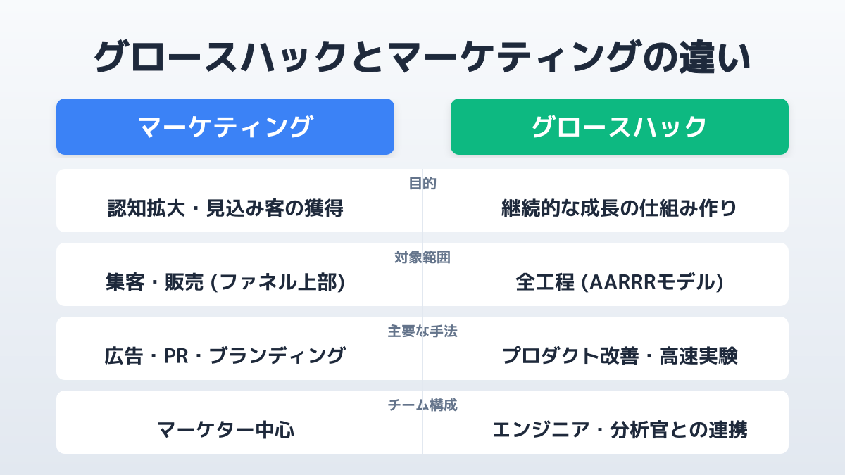 このように、グロースハックとマーケティングの違いは、製品を売るための「外部への活動」か、製品そのものを成長させる「内部の改善」かという点に明確に表れます。