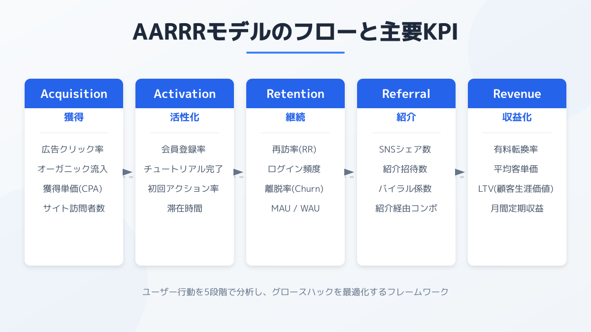 前述した重要KPIを改善し、企業価値を最大化するための実践的なフレームワークとして、グロースハックでAARRR(アー)モデルを活用する手法が有効です。
