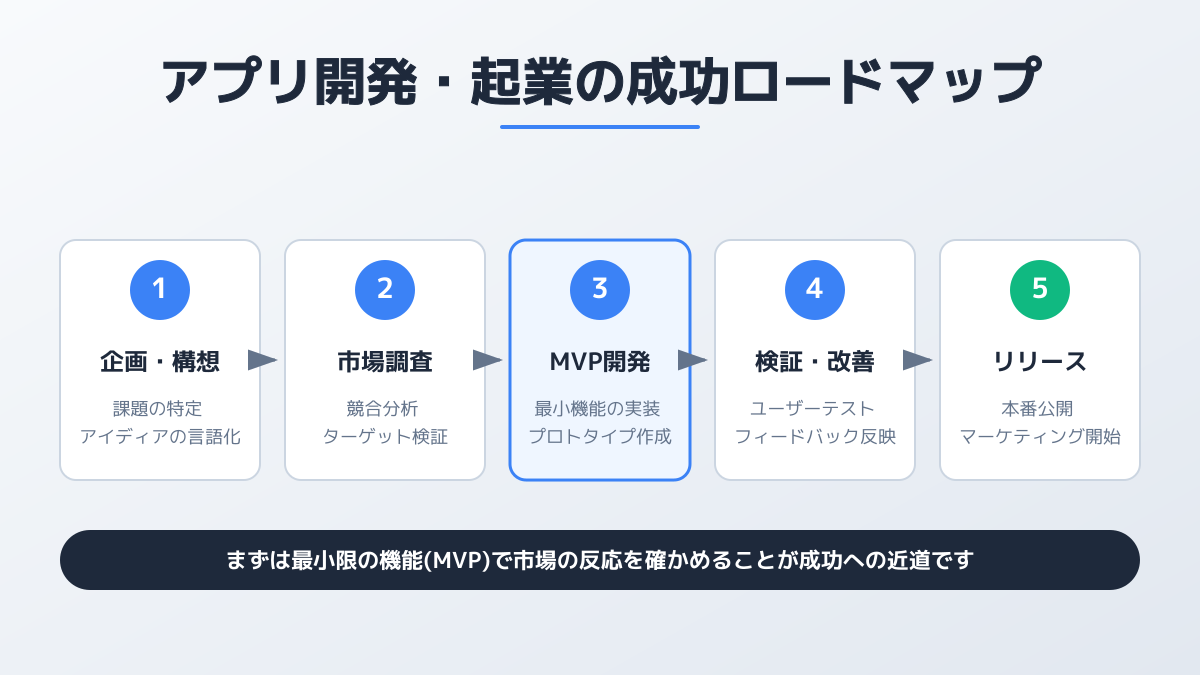 まず、市場の厳しさを理解し、初期費用を抑えたスモールスタートでリスクを最小限に抑えましょう。次に、綿密な資金計画を立て、必要に応じて外部からの資金調達も検討することが重要です。また、プログラミングスキルがなくても、ノーコードツールや信頼できる開発パートナーとの連携により、アイデアを形にすることは十分可能です。失敗事例から学び、公的な無料相談窓口を積極的に活用することで、事業計画の客観的な評価とリスク管理を強化できます。最後に、MVP開発でコア機能に絞り、早期に市場投入することで、開発期間とコストを圧縮し、成功への確実な一歩を踏み出せるでしょう。最小限の機能で検証を始める具体的なステップは、MVP開発の基本と7つの検証ステップを参考にしてください。