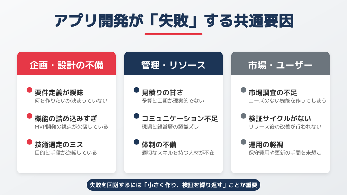 ビジネスアイデアを形にする際、開発フェーズでのつまずきが事業全体の致命傷になるケースは少なくありません。株式会社ペンタゴンによると、アプリ開発の失敗事例として、スケジュール管理の甘さ、アプリ審査要件の軽視、UI/UX軽視による低評価、要件定義不足、テスト不備によるバグ多発、運用設計の不備などが挙げられます (出典: プロが語る「失敗するアプリ開発」事例7選 | 株式会社ペンタゴン)。