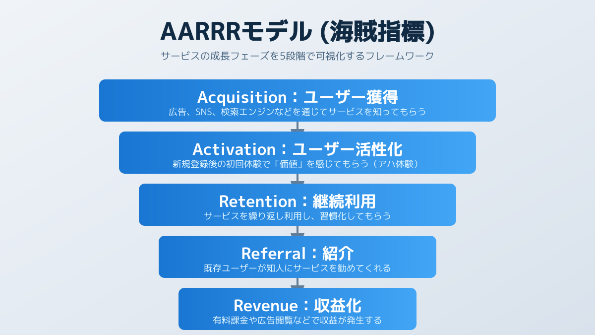 事業成長を軌道に乗せるための3つ目の戦略は、データ駆動型の意思決定プロセスにAIツールを組み込み、施策の精度を高めることです。施策の優先順位や効果を判断する際は、ユーザーの行動ファネルを可視化する「AARRRモデル」を基準にします。