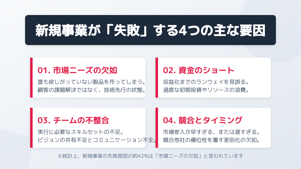 最も多い失敗原因は、自社のコアコンピタンス(強み)が活かせない、完全に未知の市場へ「市場が成長しているから」という理由だけで参入してしまうことです。また、既存事業と同じ短期的な売上指標を適用し、事業が軌道に乗る前に撤退を判断してしまうケースも多く見られます。