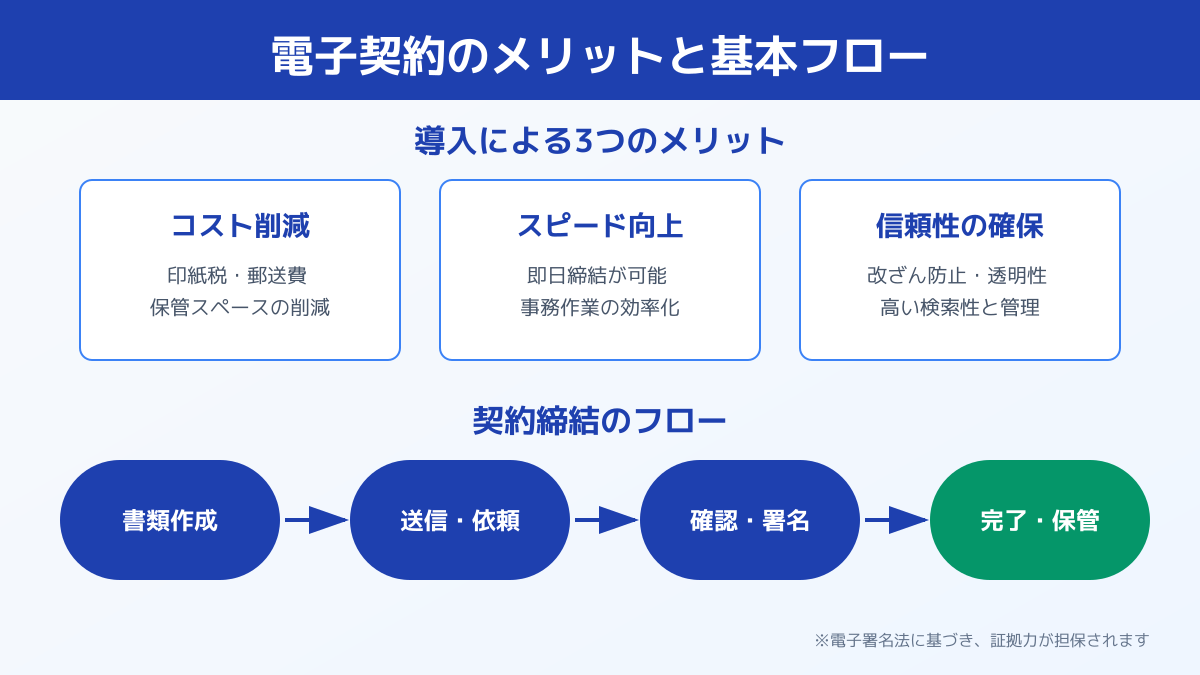 紙の契約書では印刷代や郵送費に加えて、請負契約の場合には収入印紙代(印紙税)が発生します。しかし、電子契約を利用すればこれらの印紙代などのコストを適法に削減できます。郵送のやり取りが不要になるため、契約締結までの期間を数日から数分へと短縮できる点も大きなメリットです。