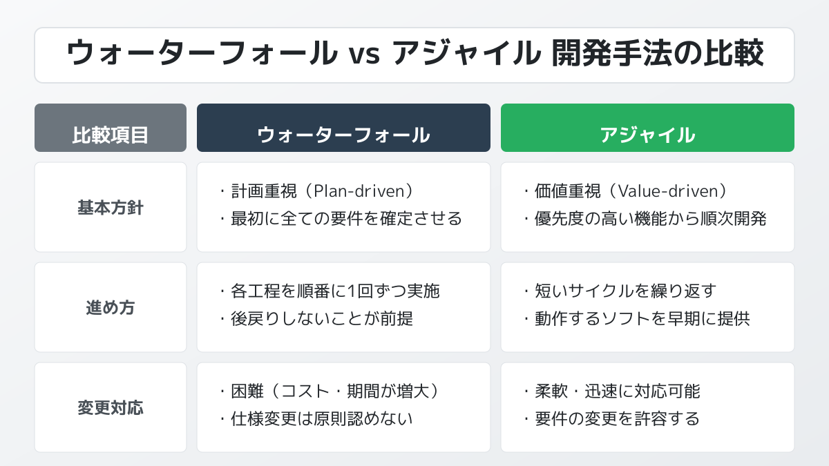 - 準委任契約: 専門的な業務の遂行に対して対価を支払う形態。要件が変わる前提のアジャイル開発や、MVP開発の初期段階に向いています。