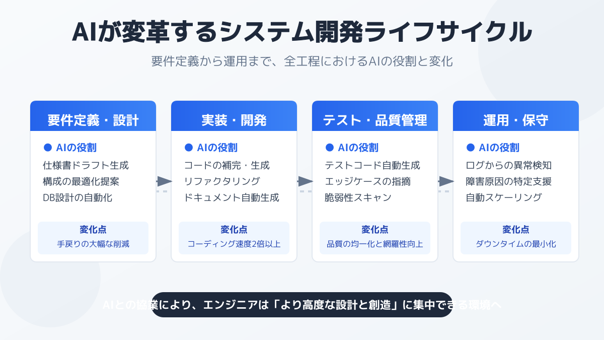 AIの導入によりコーディングやテストの工数が削減されるため、結果として開発期間の短縮や費用削減が期待できます。しかし、AIツールのライセンス費用や、AIが生成したコードをレビューするためのリソースも必要になるため、全体的な投資対効果を見極めることが大切です。