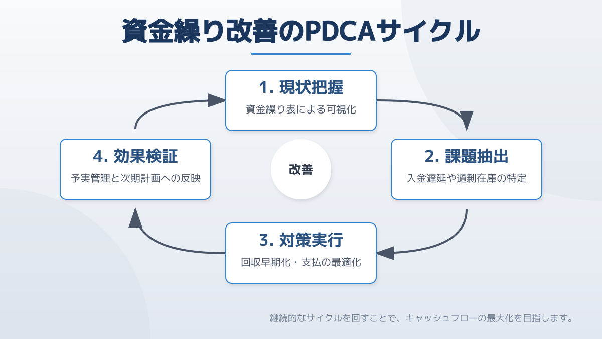 即日での資金調達は、あくまで目の前の危機を回避するための応急処置に過ぎません。ビジネスローンやファクタリングはスピードに優れる反面、コストが高くつくため、これらを常態化させると事業の利益を大きく損なってしまいます。緊急事態を乗り切った後は、速やかに根本的な資金繰りの改善に取り組む必要があります。