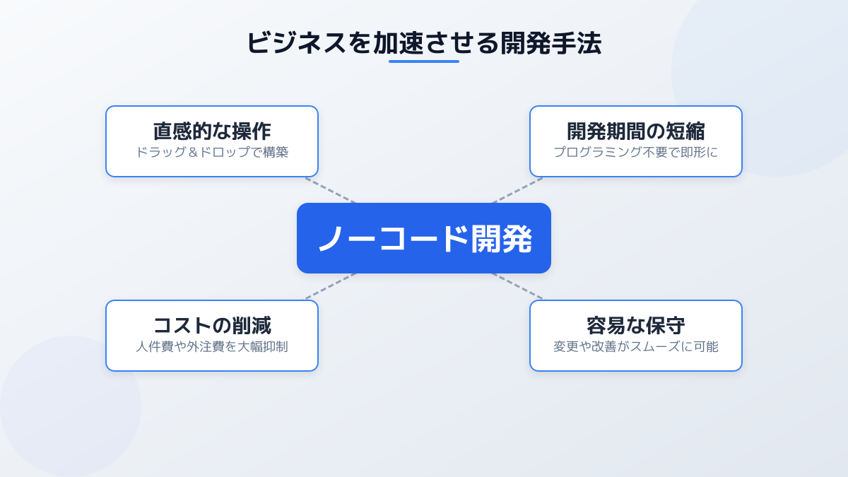 ノーコードでの開発とは、単なるITツールの導入にとどまりません。現場のニーズを最も理解しているビジネス部門や起業家自身が自ら手を動かすことで、IT部門への依存度を低減し、課題解決のスピードを飛躍的に向上させることができます。