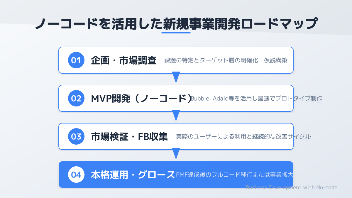 本記事では、新規事業の立ち上げを検討する方々へ向けて、ノーコードとは何か、そのメリットと導入のポイントを解説しました。ノーコード開発は、プログラミング知識不要で視覚的にアプリを構築できるため、開発スピードとコストを劇的に改善します。